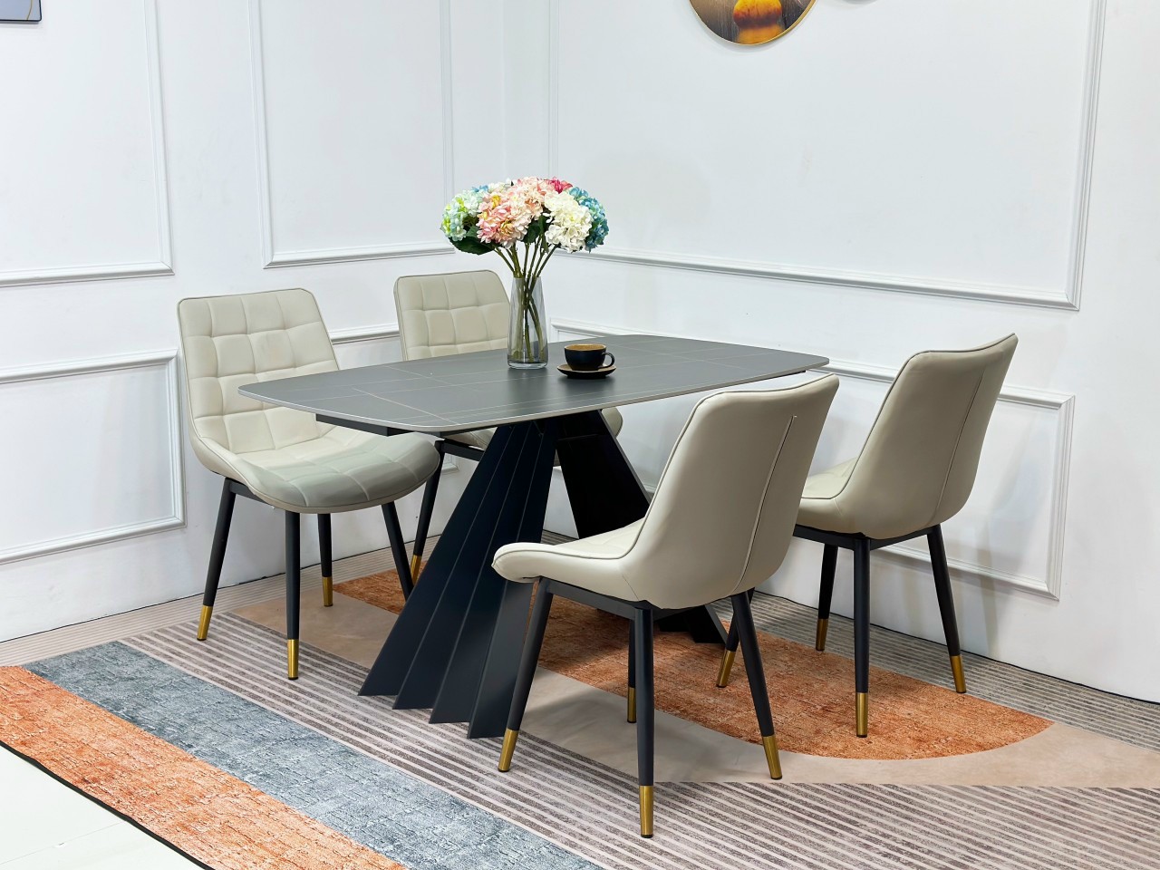 - Chân ghế bọc núm đồng sang trọng, tạo điểm nhấn tinh tế cho bộ bàn ăn.