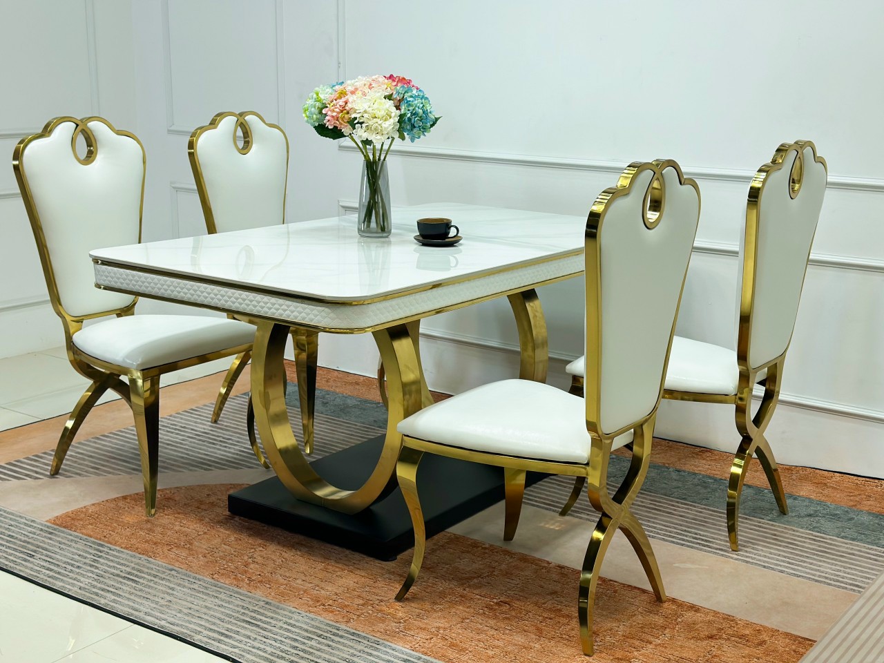 - Bàn ăn: Mặt bàn trắng, chân bàn trắng hoặc vàng gold.
